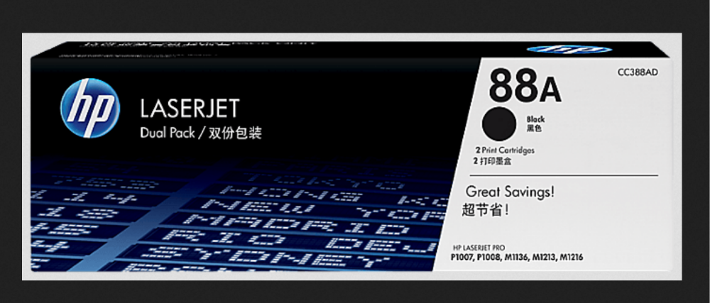 Enjoy quality and savings with the HP 88A Dual Pack Black Original LaserJet Toner Cartridge.