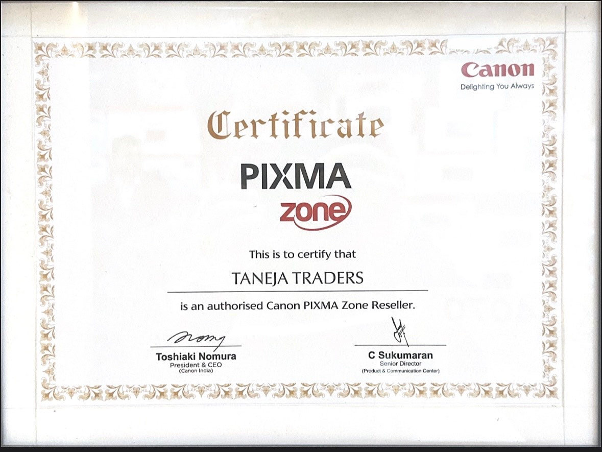 Taneja Traders is a trusted and authorized dealer of Canon products, recognized for offering genuine, high-quality Canon products and services. As a certified partner, we ensure that all products sold are 100% authentic and sourced directly from the manufacturer. Our Canon Authorized Dealer certificate guarantees that customers receive reliable and genuine products with full warranty support. Trust Taneja Traders for all your Canon needs, where authenticity and customer satisfaction are our top priorities.
